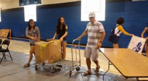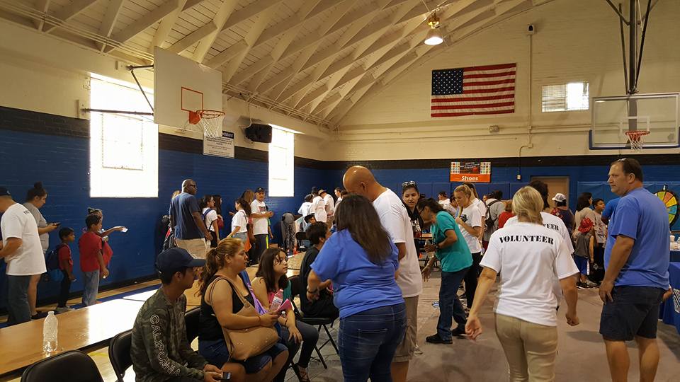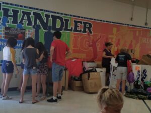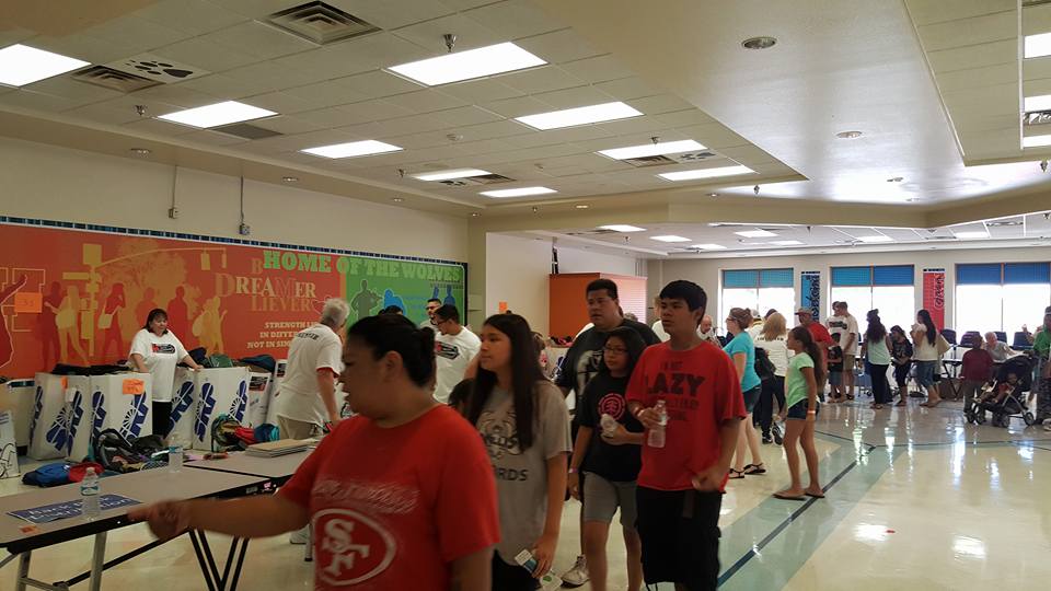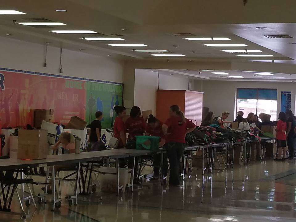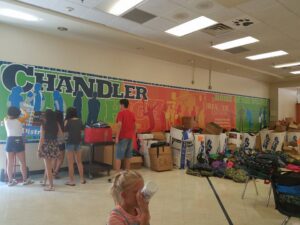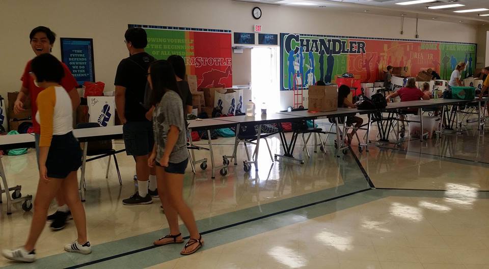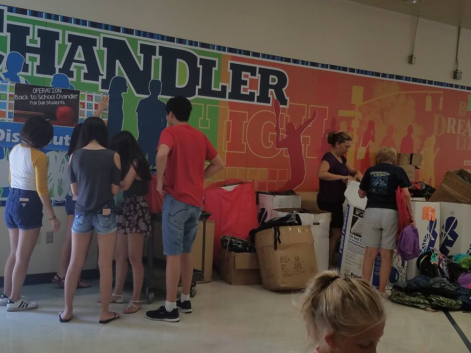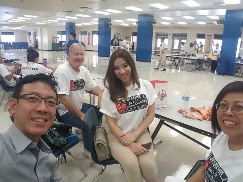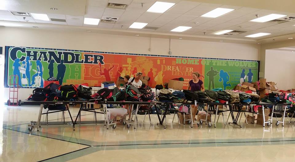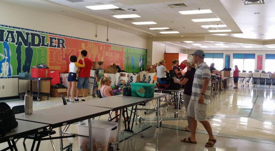 Sắp xếp bàn ghếCác thùng đựng giàyCác backpacksCác thiện nguyện viên cùng với Ông Kevin Hartke, Vice Mayor City of ChandlerNgày hôm đó cũng có chương trình cắt tóc cho các học sinh