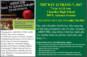 Để chuẩn bị cho các em học sinh bước vào năm học mới, vào sáng thứ bảy ngày 22 tháng 7, Cộng Đồng Việt Nam AZ (CĐVNAZ) cùng các Hội Từ Thiện và các thiện nguyện viên đã hợp tác với The City of Chandler để tổ chức chương trình Operation Back to School (Trở Lại Trường Học). Đây là chương trình phát cặp đi học (backpack), quần áo, giày, sách vỡ, v.v… đặc biệt chỉ dành cho các em học sinh từ lớp mẫu giáo đến lớp 12 đang cư ngụ tại thành phố Chandler. Chương trình nầy đã được chuẩn bị từ mấy tháng trước. Các thiện nguyện viên đã đi họp thường xuyên với The City of Chandler để chương trình được tổ chức một cách chu đáo.