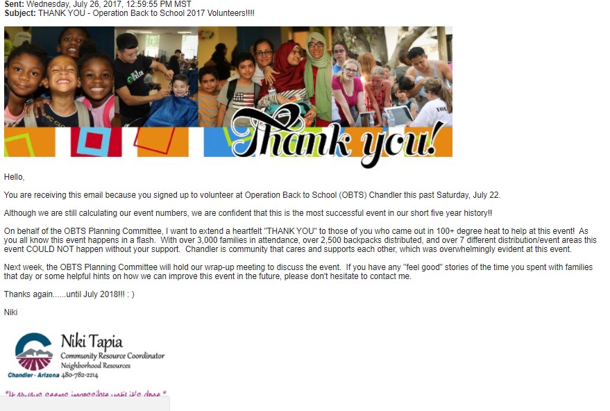 Chỉ trong vòng hơn 3 tiếng đồng hồ, The City of Chandler với sự cộng tác của các thiện nguyện viên đã giúp hơn 3,000 gia đình và phát ra hơn 2,500 backpacks cho các em học sinh. Chúng tôi thật cảm động khi thấy có gia đình đã đứng xếp hàng từ 1:00 giờ sáng và phải chờ đến 7:00 giờ sáng để nhận được backpacks, quần áo, giày vớ để chuẩn bị cho ngày tựu trường của con em mình. Đây là một trong nhiều chương trình mà CĐVNAZ sẽ hợp tác với thành phố để tiếp tục đem lại nhiều phúc lợi đến cho CĐVN AZ nói riêng và cho tất cả người dân sống tại vùng East Valley này. Đính kèm là lá thư cám ơn của The City of Chandler